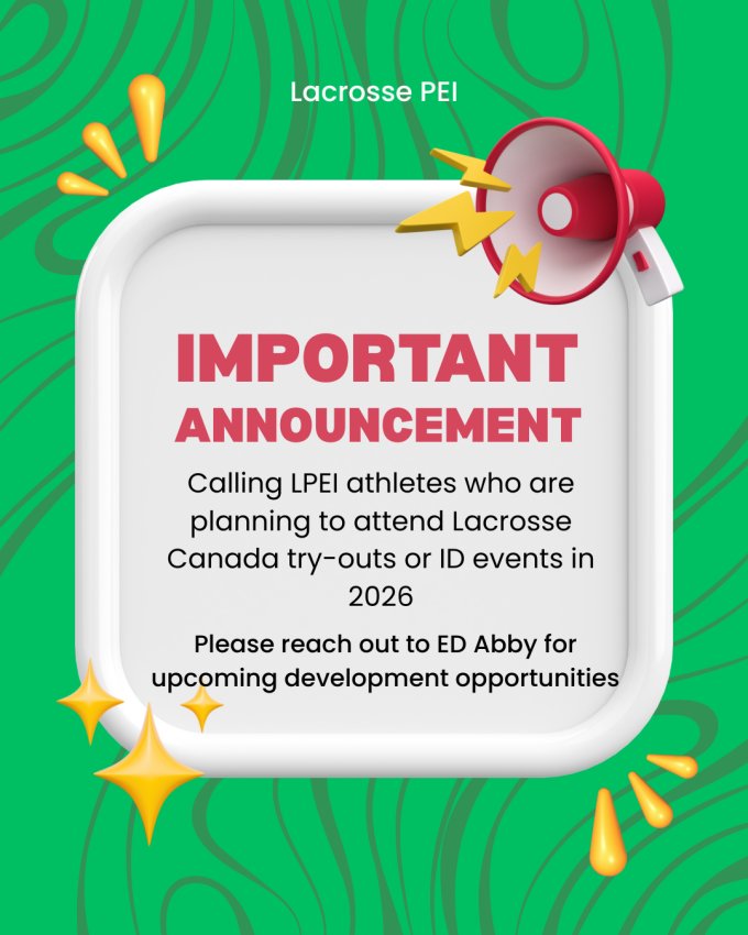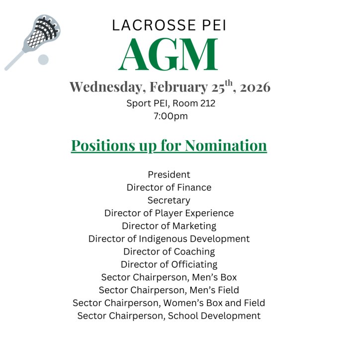 Room 212 at Sport PEI is booked for 7pm, and a Zoom link will be made available closer to the meeting date. All Lacrosse PEI Members are welcome!